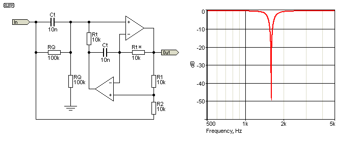 Rangkaian di atas dapat diubah pada rentang yang wajar dengan memvariasikan resistor R t * - dapat diubah dari 5k ke 20k, memberikan frekuensi dari sekitar 2,25kHz hingga 1,13kHz dengan nilai lainnya tidak berubah. Q memang bervariasi (seperti halnya kedalaman takik), tetapi kinerjanya memuaskan selama rentang tersebut. Filter ini menjadi kandidat yang sangat baik untuk menghilangkan frekuensi 'gangguan' seperti dengung 50/60Hz, atau bahkan feedback microphone.